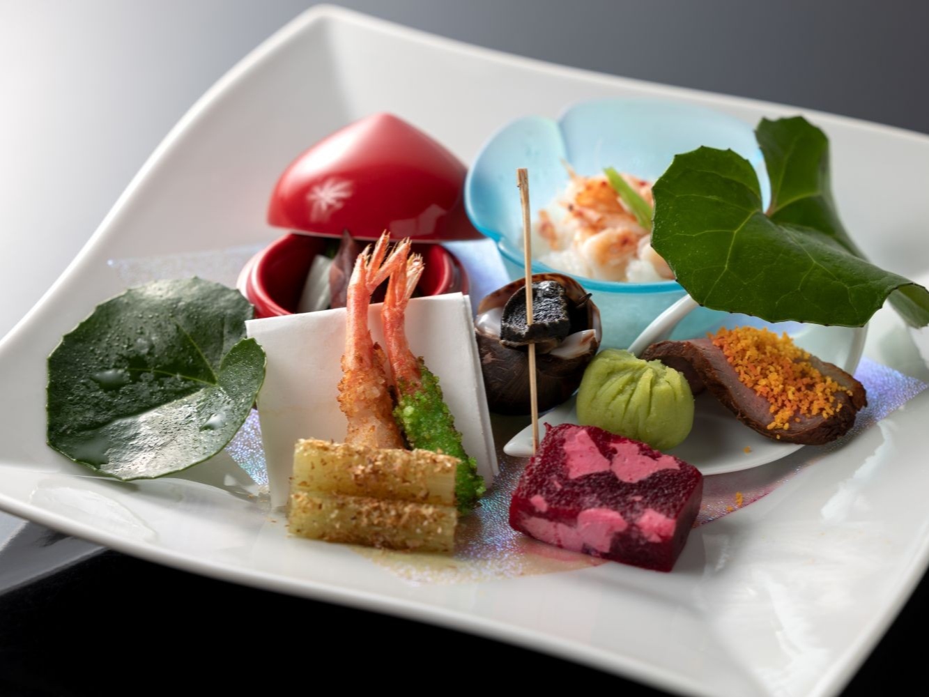 桜海老寿司 鴨山吹 甘海老美人粉揚げ チーズビーツ寄せ 唐津産バイ貝 蛍烏賊と分葱 蕗土佐煎り 蚕豆金団